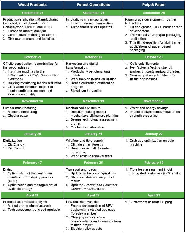 Research Information Sharing and Feedback (RISF) webinars are offered to FPInnovations’ members to highlight results and solutions from recent research projects. They also present an opportunity to gather feedback on continuing projects to maximize value for your operations and the industry.